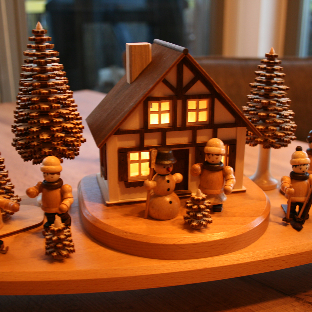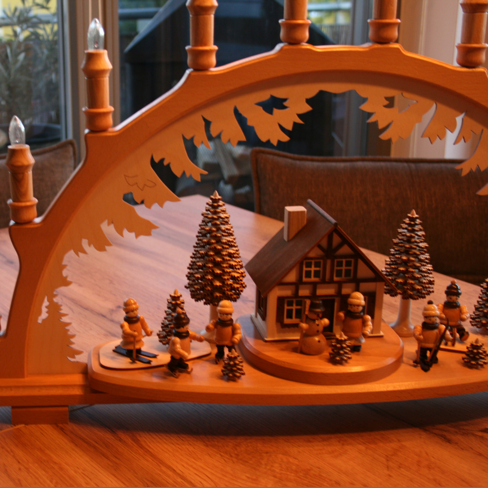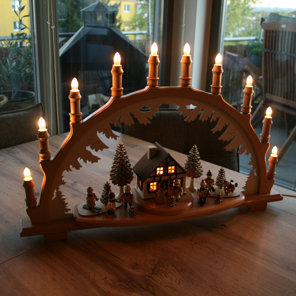 - Produkt: 3D Holz-Schwibbogen / Lichterbogen inkl. Beleuchtung 10 flammig + beleuchteten Haus, Figruen im Winter + Schneemann und Schichtbäume - Hergestellt im Erzgebirge!