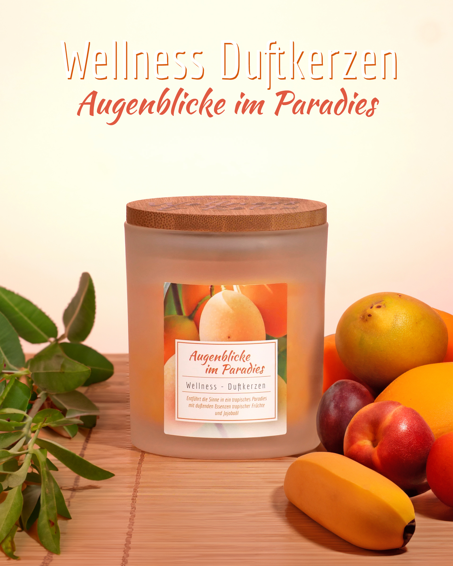 Produkt: Wellnesskerze Wellness KerzeMotiv: Augenblicke im ParadisDuft: Tropische Früchte & JojobaölGröße H x Ø: ca. 9,7 x 8 cmBrenndauer: ca. bis zu 30 Stunden