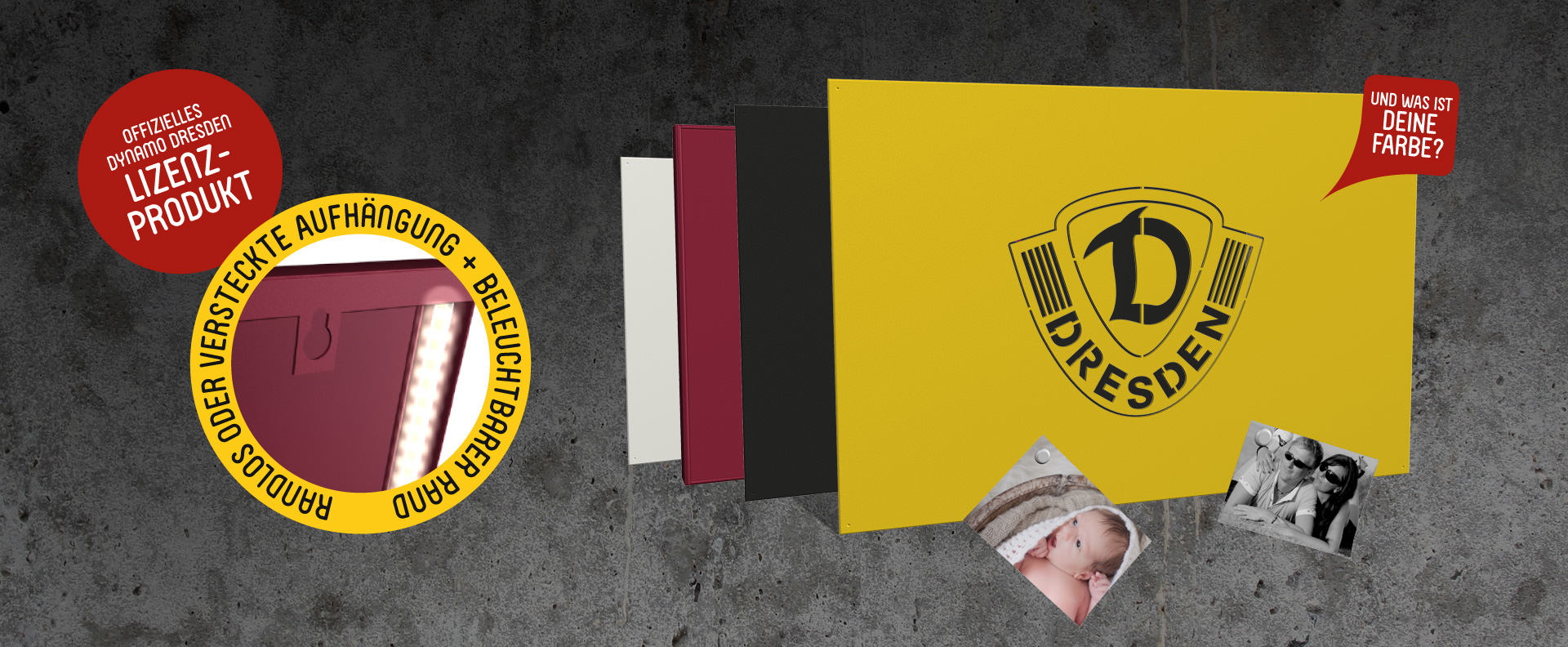 Das gewisse etwas für jeden Dynamo Fan Magnetwand / Pinnwand / WandtafelProdukt: Magnetwand / Pinnwand / Wandtafel [ser stark magnetisch - es halten auch schwache Magnete daran]Ausführung: Rahmen 2 cm dick / Es besteht die möglichkeit in den Rahmen innen ein 1 cm dickes LED-Band einzukleben (LED-Band ist nicht im Lieferumfang enthalten)Farbe: Größe: 40 x 60 cm 50 x 80 cm 50 x 110 cmMaterial und Stärke der Magnetwand: Metall ca. 1,5 mm Gewicht: Ausführung / Lieferumfangdie Magnetwand ist beschichtetdie Magnetwand hat eine verdeckte Aufhängung um sie horizontal an der Wand zu befestigen2 passende Schrauben und Dübel sind im Lieferumfang enthaltendie Magnetwand ist für handelsübliche Magnete geeignetoffizielles Lizenzprodukt von Dynamo Dresden