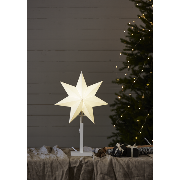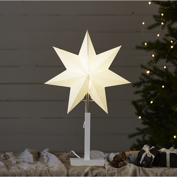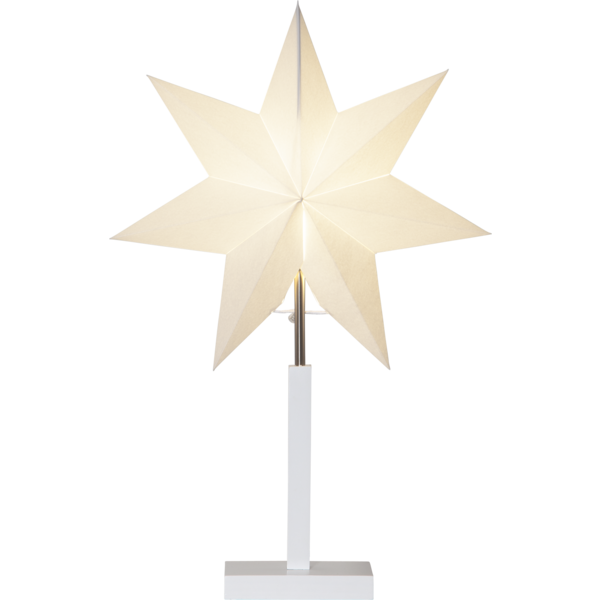 Produkt: Kombi-Leuchte mit Wechselschirm und Papierstern Farbe: weiß Maße: 64 x 43 cm (bei Verwendung des Sternaufsatzes) - der neutrale Wechselschirm hat die Maße 17 x 12 x 15cm) Material: Standfuß aus Holz und Lampenstil aus Metall Technische Daten: mit Fassung E14 / 230 V und schwarzer Zuleitung 1,8 m mit Schnurzwischenschalter für Birnenlampe 25W max. Da jede Lichtquelle (Brennpunkt) unter 30 Lumen hat ist keine Energiekennzeichnungspflicht notwendig und möglich!