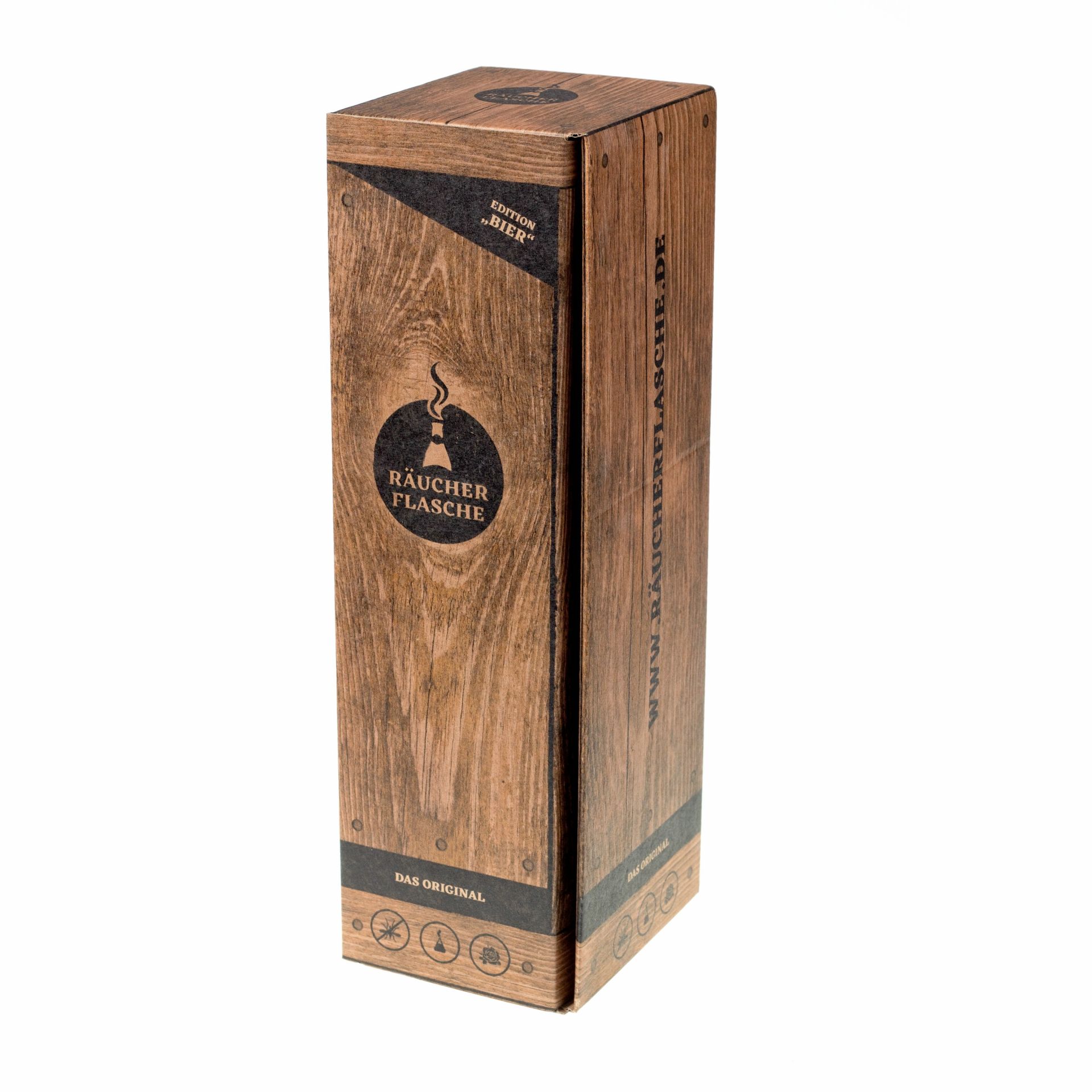 Produkt: Räucherflasche Bier Longneck 0,5 l „zur Selbstgestaltung" inkl. hochwertigem Geschenkkarton in Holz-OptikFarbe der Räucherflasche: braunMaterial: hochwertiges Eschen-Holz Größe: ca. 27 cm hochGewicht: ca. 400 g schwerBesonderheiten: Unsere Räucherflaschen werden in Handarbeit im Erzgebirge hergestellt und sind beim Deutschen Patent- und Markenamt geschützt. Sie werden mit duftenden Räucherkerzchen betrieben (nicht im Lieferumfang enthalten aber in unseren Onlineshop zusätzlich bestellbar) und sind ein Hingucker, Partygag oder Geschenk für Weihnachten aber auch für jede andere Jahreszeit. Im Gegensatz zu klassischen Räuchermännchen oder Räucherfiguren ist unsere Räucherflasche auf Grund ihrer neutralen Optik aber ganzjährig nutzbar. So können neben vielen verschiedenen Düften für die Sommer- oder Weihnachtszeit auch spezielle Räucherkerzchen mit einem angenehmen Kräuterduft verwendet werden. Dieser ist ideal für laue Sommerabende denn Menschen mögen ihn, Mücken und Wespern eher weniger.Wichtige Hinweise: Unsere Räucherflaschen werden ausschließlich im Erzgebirge hergestellt!Holz ist ein natürlicher Rohstoff, deshalb stellen kleine dunkle Einschlüsse oder Streifen keinen Qualitätsmangel darRäucherflaschen sind nur für InnenräumeVor Feuchtigkeit schützenAchtung: Nicht ohne Aufsicht betreiben! Nicht für Kinderhände! Nur Räucherkerzen bis 3 cm Höhe verwenden und keine Kerzen!