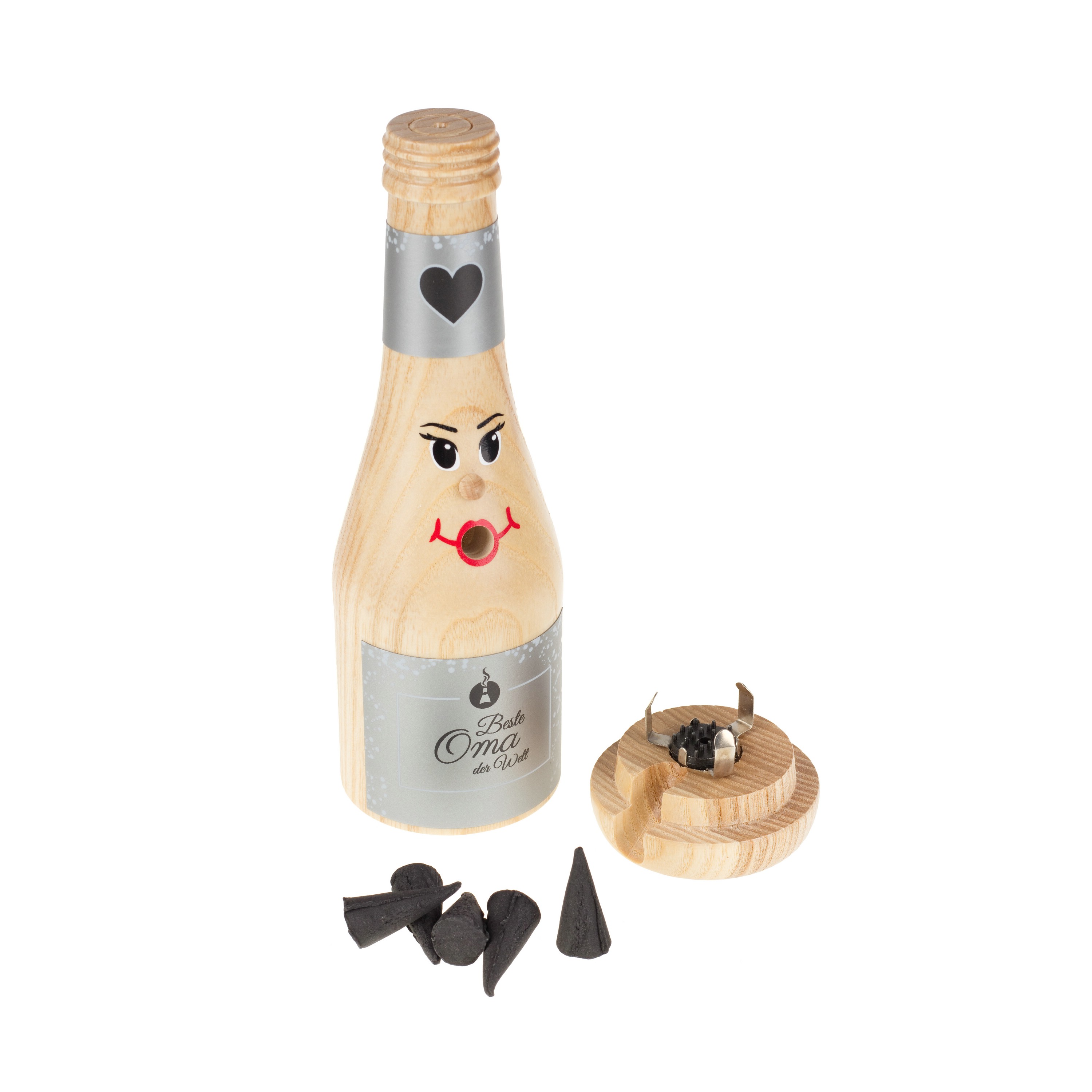 Produkt: Räucherflasche Sekt 0,2 l „Beste Oma" inkl. hochwertigem Geschenkkarton in Holz-OptikFarbe der Räucherflasche: weißMaterial: hochwertiges Eschen-HolzGröße: ca. 19 cm hochGewicht: ca. 180 g schwerBesonderheiten: Unsere Räucherflaschen werden in Handarbeit im Erzgebirge hergestellt und sind beim Deutschen Patent- und Markenamt geschützt. Sie werden mit duftenden Räucherkerzchen (nicht im Lieferumfang enthalten aber in unseren Onlineshop zusätzlich bestellbar) und sind ein Hingucker, Partygag oder Geschenk für Weihnachten aber auch für jede andere Jahreszeit. Im Gegensatz zu klassischen Räuchermännchen oder Räucherfiguren ist unsere Räucherflasche auf Grund ihrer neutralen Optik aber ganzjährig nutzbar. So können neben vielen verschiedenen Düften für die Sommer- oder Weihnachtszeit auch spezielle Räucherkerzchen mit einem angenehmen Kräuterduft verwendet werden. Dieser ist ideal für laue Sommerabende denn Menschen mögen ihn, Mücken und Wespern eher weniger.Wichtige Hinweise: Unsere Räucherflaschen werden ausschließlich im Erzgebirge hergestellt!Holz ist ein natürlicher Rohstoff, deshalb stellen kleine dunkle Einschlüsse oder Streifen keinen Qualitätsmangel darRäucherflaschen sind nur für InnenräumeVor Feuchtigkeit schützenAchtung: Nicht ohne Aufsicht betreiben! Nicht für Kinderhände! Nur Räucherkerzen bis 3 cm Höhe verwenden und keine Kerzen!