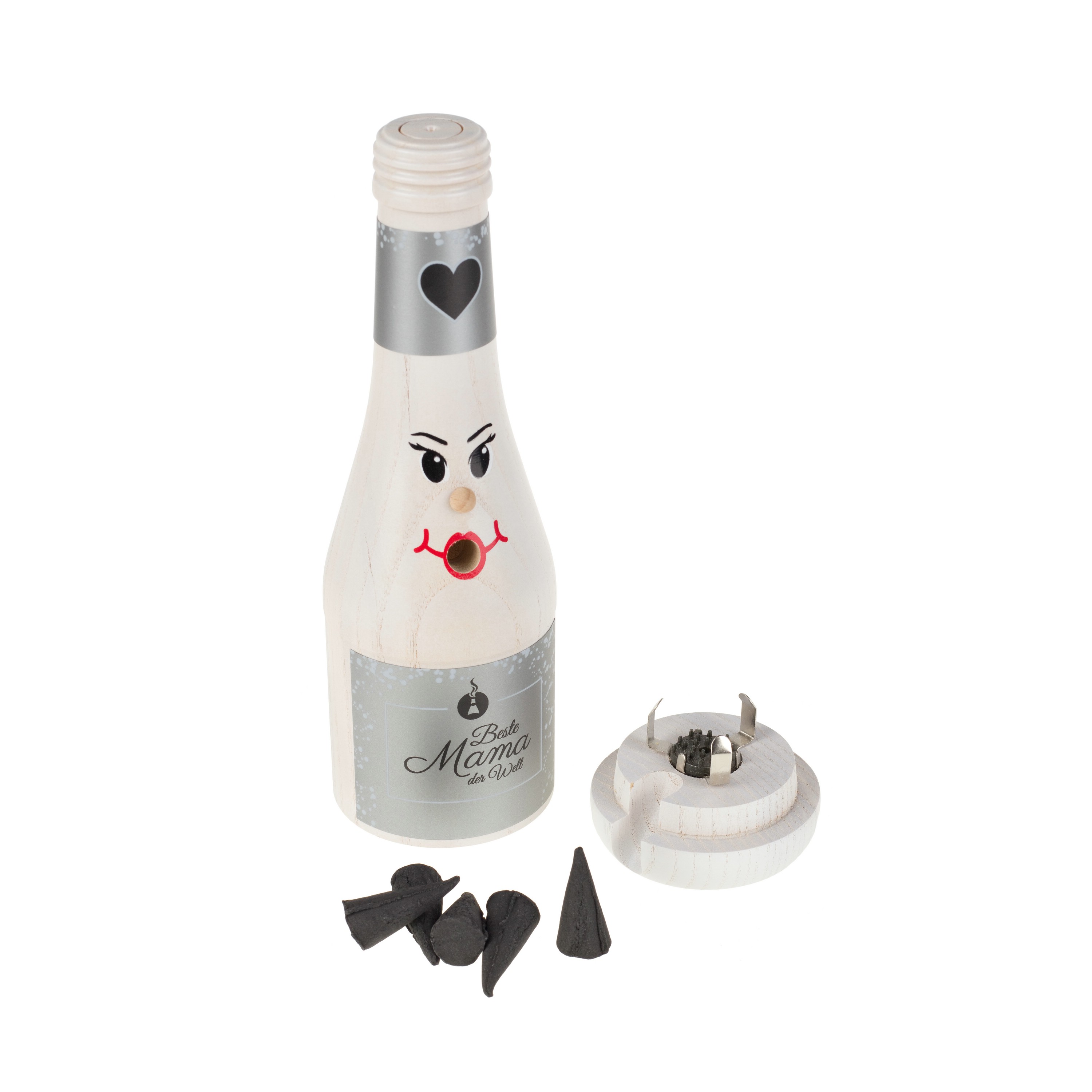 Produkt: Räucherflasche Sekt 0,2 l „Best Mom ever" inkl. hochwertigem Geschenkkarton in Holz-OptikFarbe der Räucherflasche: weißMaterial: hochwertiges Eschen-HolzGröße: ca. 19 cm hochGewicht: ca. 180 g schwerBesonderheiten: Unsere Räucherflaschen werden in Handarbeit im Erzgebirge hergestellt und sind beim Deutschen Patent- und Markenamt geschützt.Sie werden mit duftenden Räucherkerzchen (nicht im Lieferumfang enthalten aber in unseren Onlineshop zusätzlich bestellbar) und sind ein Hingucker, Partygag oder Geschenk für Weihnachten aber auch für jede andere Jahreszeit.Im Gegensatz zu klassischen Räuchermännchen oder Räucherfiguren ist unsere Räucherflasche auf Grund ihrer neutralen Optik aber ganzjährig nutzbar. So können neben vielen verschiedenen Düften für die Sommer- oder Weihnachtszeit auch spezielle Räucherkerzchen mit einem angenehmen Kräuterduft verwendet werden. Dieser ist ideal für laue Sommerabende denn Menschen mögen ihn, Mücken und Wespern eher weniger.Wichtige Hinweise: Unsere Räucherflaschen werden ausschließlich im Erzgebirge hergestellt!Holz ist ein natürlicher Rohstoff, deshalb stellen kleine dunkle Einschlüsse oder Streifen keinen Qualitätsmangel darRäucherflaschen sind nur für InnenräumeVor Feuchtigkeit schützenAchtung: Nicht ohne Aufsicht betreiben! Nicht für Kinderhände! Nur Räucherkerzen bis 3 cm Höhe verwenden und keine Kerzen!