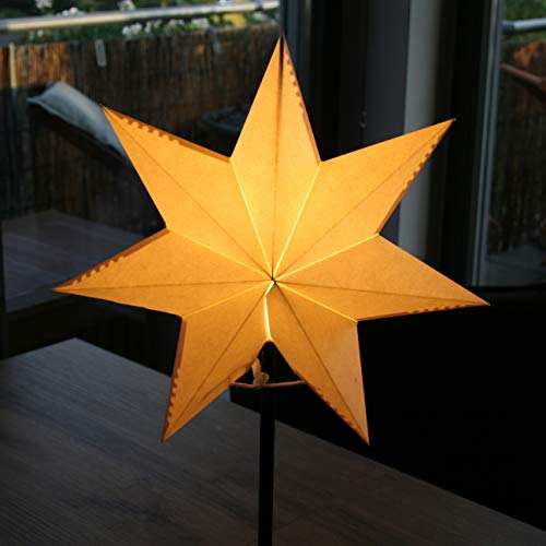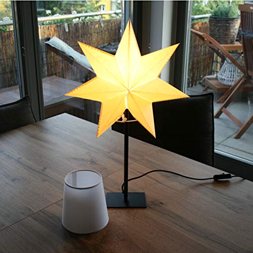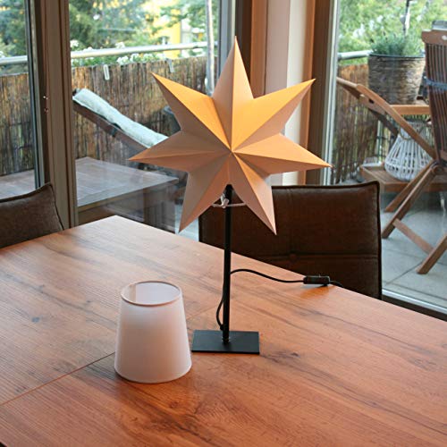 Produkt: Weihnachtsstern mit Holz-Fuß und Gestell Holz Eiche (Innenbereich)Beleuchtung: Fassung E14/230V und weißer Zuleitung 1,8 m mit Schurzwischenschalter für Birnenlampe 25W max.(Leuchtmittel ist nicht im Lieferumfang enthalten)Maße: ca. 34 x 55 cm Aufsatz: Papierstern Ø 34 cm perforiert Da jede Lichtquelle (Brennpunkt) unter 30 Lumen hat ist keine Energiekennzeichnungspflicht notwendig und möglich!