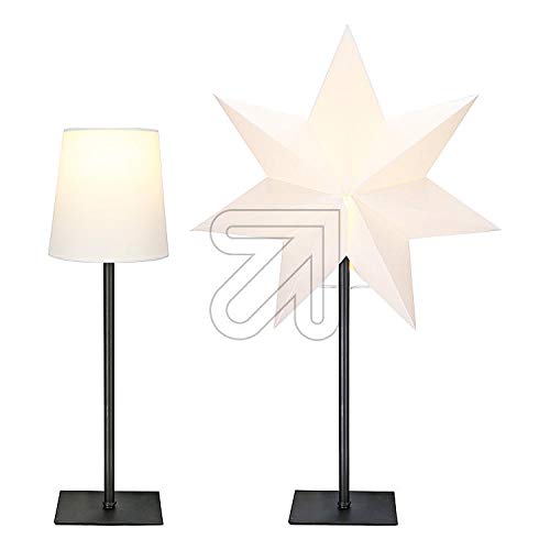 Produkt: Kombi-Leuchte mit Wechselschirm und Papierstern Farbe: weiß Maße: 64 x 43 cm (bei Verwendung des Sternaufsatzes) - der neutrale Wechselschirm hat die Maße 17 x 12 x 15cm) Material: Standfuß aus Holz und Lampenstil aus Metall Technische Daten: mit Fassung E14 / 230 V und schwarzer Zuleitung 1,8 m mit Schnurzwischenschalter für Birnenlampe 25W max. Da jede Lichtquelle (Brennpunkt) unter 30 Lumen hat ist keine Energiekennzeichnungspflicht notwendig und möglich!